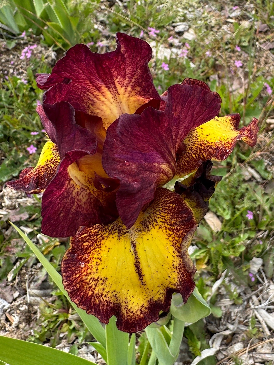 The remarkable Red Hot Chili reblooming intermediate bearded iris! Its yellow standards are beautifully tinged with a rich ruby red hue, while its bright yellow falls are adorned with a delicate rust-dotted edge.